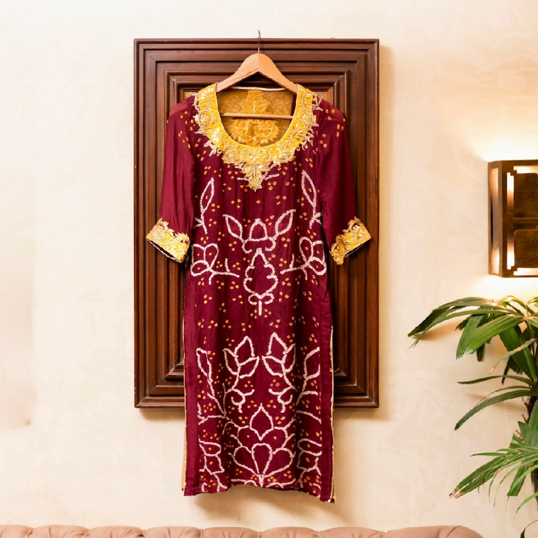 The Nivedita Saboo Bandhani Kurta is a stunning piece of ethnic attire that seamlessly blends tradition with contemporary style. Crafted with exquisite attention to detail, this kurta features intricate bandhani work, a traditional tie-dye technique native to Kutch. The vibrant colors and delicate patterns of the bandhani design lend an air of elegance and sophistication to the garment.